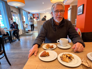 We had a lazy morning, not turning out until 9:30 or so. I moved the car out of a zone where parking fees began at 10 and we walked down our street to a nice, up-scale Dunkin’ for breakfast. Sweet rolls and hot chocolate with coffee.