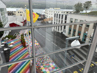 Around the corner is the Akureyri Art Museum, indoors, so that was first on our agenda. It was a great collection of Icelandic and Arctic Circle-ish artists whose Is This North collection was part of the Reykjavik Art Festival we saw way back week before last. As far as I could tell, every single artist shown there is still alive, most young enough to be our kids and some our grandkids. Nary an Old Master and hardly a daub of oil.