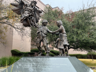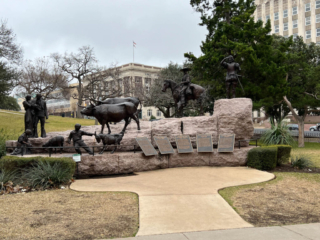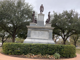 We walked around the grounds admiring the several monuments and sculpture pieces. We found two prominent monuments commemorating Texas’s role in the Confederacy (there are apparently seven in all). One, the Confederate Soldiers Monument (aka the Confederate Dead Monument), was quite striking. It was erected to “normalized the motivations that drew Texas into the Civil War.” An inscription on the monument reads, in part: