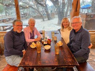 The Texas Historical Museum was closed today so we left downtown a little earlier than planned and drove to meet our friends Joanne and Dan Tims at the Salt Lick BBQ restaurant in Driftwood, TX, about a half-hour west of town in hill country. It’s a low-key down-home picnic table kind of place but they serve great BBQ. Best of all, of course, was our three-hour visit with former neighbors we haven’t seen since 2004 when we left Minnesota. They have three kids and five grandkids which, coupled with our two and four, gave us lots to catch up on. Joanne and Dan have had a fascinating later-in-life career working with Samaritan Purse, an NGO that provides relief to those suffering from natural and political disasters. They served two years in Greece, among many other places, aiding refugees from Syria. A truly inspiring story of great sacrifice and service by Joanne and Dan.