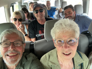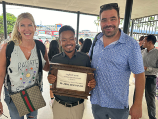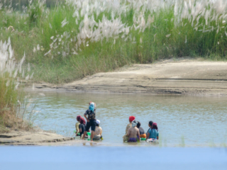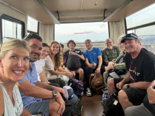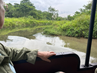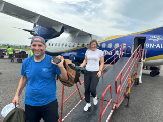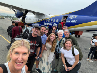 Problem was, their flight to Doha was late and the connection to Kathmandu was on time so they missed the flight. No problem, they could hang out in the Qatar lounge, get a shower, some food, some Zs. Not a bad way to spend 8 hours. Second problem: their flight got to Kathmandu OK but then circled again and again, probably due to weather in the area. Finally they landed. Jeff met the plane, discussed the situation with the Buddha Air folks (diplomatic relations may need a few days to heal) and at the last minute, onto the transfer bus they came. All’s well and we’re all ten of us in Chitwan at the Taj Safari resort.