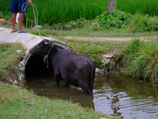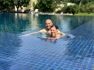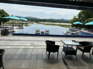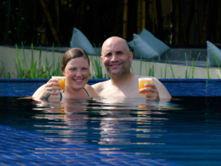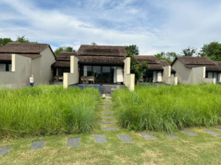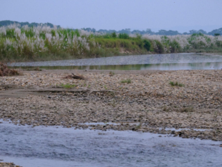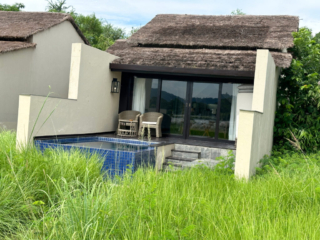 The resort is magnificent. Individual cabana-style cabins complete with outside shower and an individual front-porch infinity pool. Our unit overlooks the Rapti River where crocodiles will appear in the late afternoon. There’s a rather flimsy looking wire fence between us and the river to keep the rhinos where they belong.