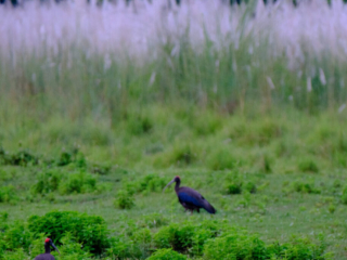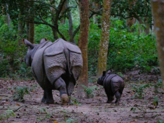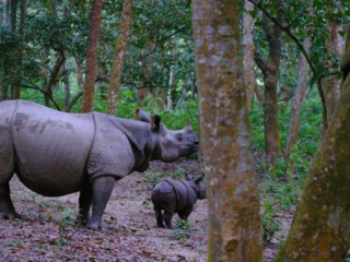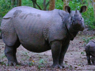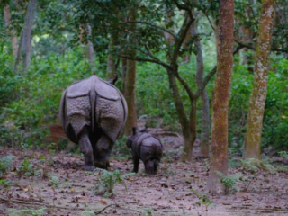 In the end, we did see lots of spotted deer. We saw a peacock and several other birds, including a red headed ibis, similar in shape to the ibis we see every day in Florida. We saw the head of a crocodile floating in the Ripta Rive. And, at the very end of our journey, sure enough, we found a rhino and her baby. Quite a thrill.
