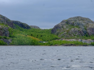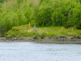 We jumped ship about 9:30 this morning and before going totally solo we went on one last prearranged trip. It was a riverboat ride from Kirkenes to the Norwegian-Russian border, about 10 miles upstream. The boat was long and narrow, maybe 6 feet wide; there were only six of us on the trip so there was lots of room (it must hold 30 or more). The weather was chilly and overcast with spray as we motored up stream at a pretty good rate. Not much in the way of scenery although I noticed that unlike yesterday there are lots of trees. We still had the granite outcroppings but having come south overnight from North Cape we were back in a much more forgiving climate.