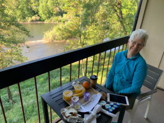 We picked this hotel because the gal behind the desk last night said, “Oh yes, the Valley River Inn. I stayed there when I was in the eighth grade and we went shopping in Eugene. It was a really neat place, as I recall.” She might have thought that was a long time ago but not from the perspective of old folks like us. And it is a really neat place, it turns out. Tonight’s room is a duplicate of last night’s in that both have a balcony that overlooks a swiftly-flowing river.