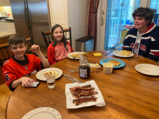 On Martin Luther King Day – Monday – all three grandkids were off from school, so we took Carter down to Melrose and spent the day with Griffin and Esme. We had a waffle breakfast, walked the three grand-dogs, and played in the park and then went to see a movie – American Underdog – the Kurt Warner Story. Recommended for those looking for football action combined with a three-hanky tearjerker. Griffin loved the football action but hid his eyes for the kissing scenes. We drove back to Manchester with Carter so he could attend his 8:30 PM hockey practice.