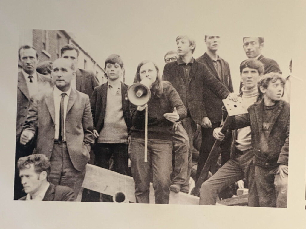 Woman with bull horn – is Bernadette McAliskey, a woman who defied odds and became a civil rights leader and later a member of Parliament in London.