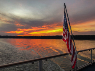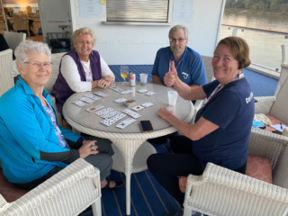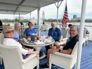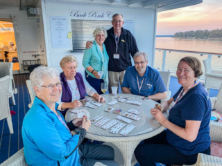 We cast off from Baton Rouge at about 12:30 PM and are fighting our way upstream toward Natchez, watching refineries, barge flotillas and the bayous pass by. Judy, Rolande, Sharon and Dave played cards on the Deck 4 stern veranda. A wine party in Dave and Ro’s cabin, dinner and a show recapping 80 years of Broadway musicals and we’re all ready for bed.