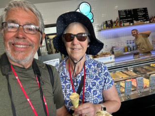 The walking tour then traversed a street one block away from the light rail street. It was a residential neighborhood, once run down but now gentrified in turn-of-the-twentieth century houses. The culmination of this not so strenuous hike was ice cream at a parlor near the beach. Great ice cream, but then again in all our travels we’ve never encountered anything but great ice cream. It took two runs of the bus to get us all back. Judy and I were unfortunate to be in the second bus. I whiled away the 30-minute delay with a wade in the chilly Pacific Ocean waters. Couldn’t find a surfboard though. Crikey.
